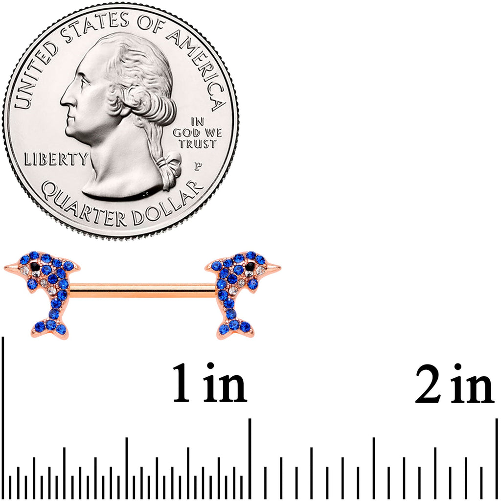 14G 9/16 Blue Gem Rose Gold Tone Dolphin Barbell Nipple Ring Set
