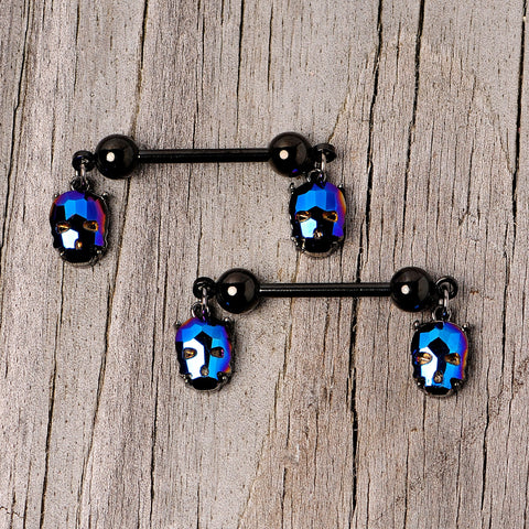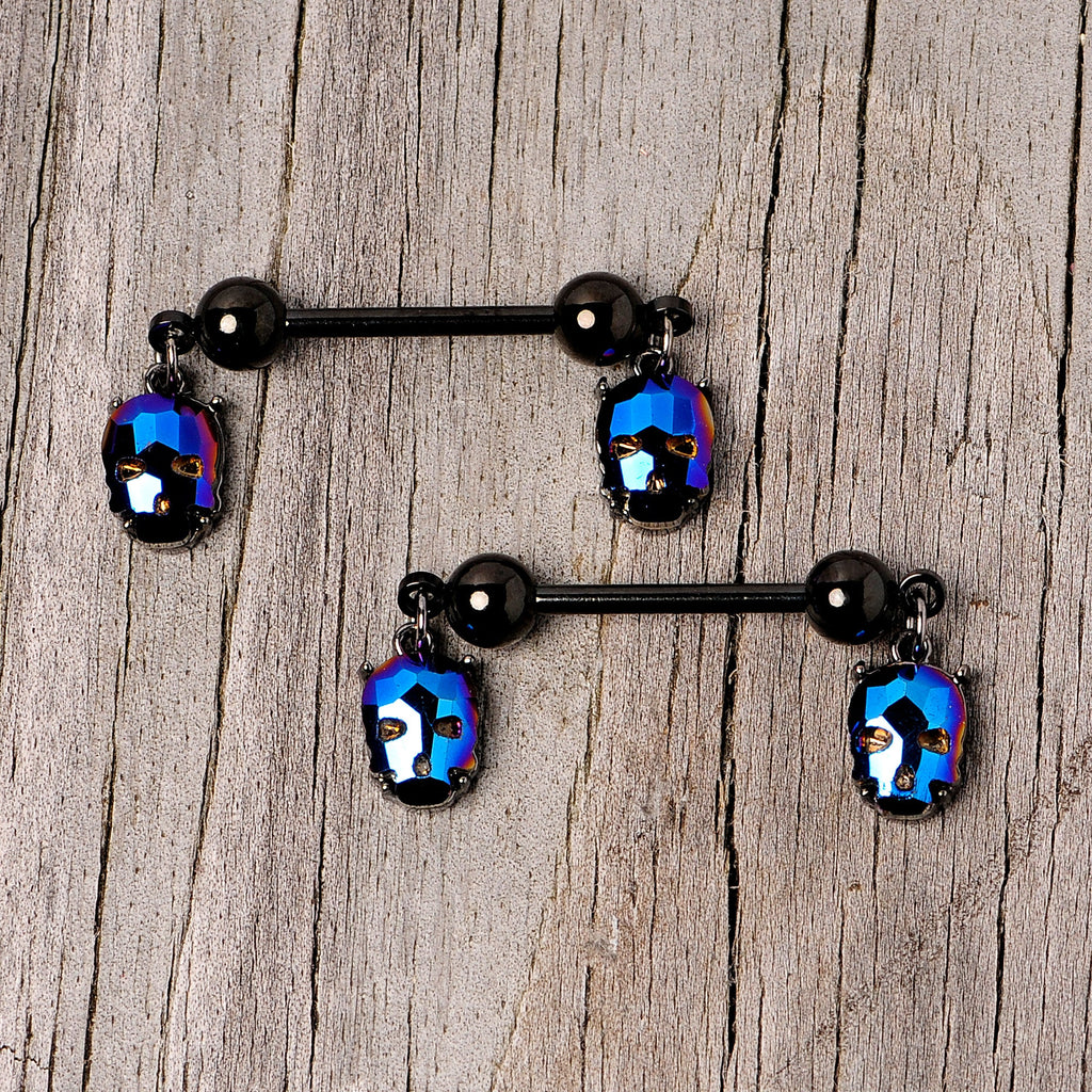 Creepy. cool, and totally captivating! These 14 gauge nipple rings are made with 14mm black PVD over 316L surgical grade stainless steel straight barbells with 5mm ball ends. Dangling from the ends are faceted forward-facing sugar skull charms composed of blue gems. They shift towards purple, adding even more visual interest. Perfect for Halloween, Dia de los Muertos, or any time you want to add some color to your nipple piercings! Sold as a set of two.
