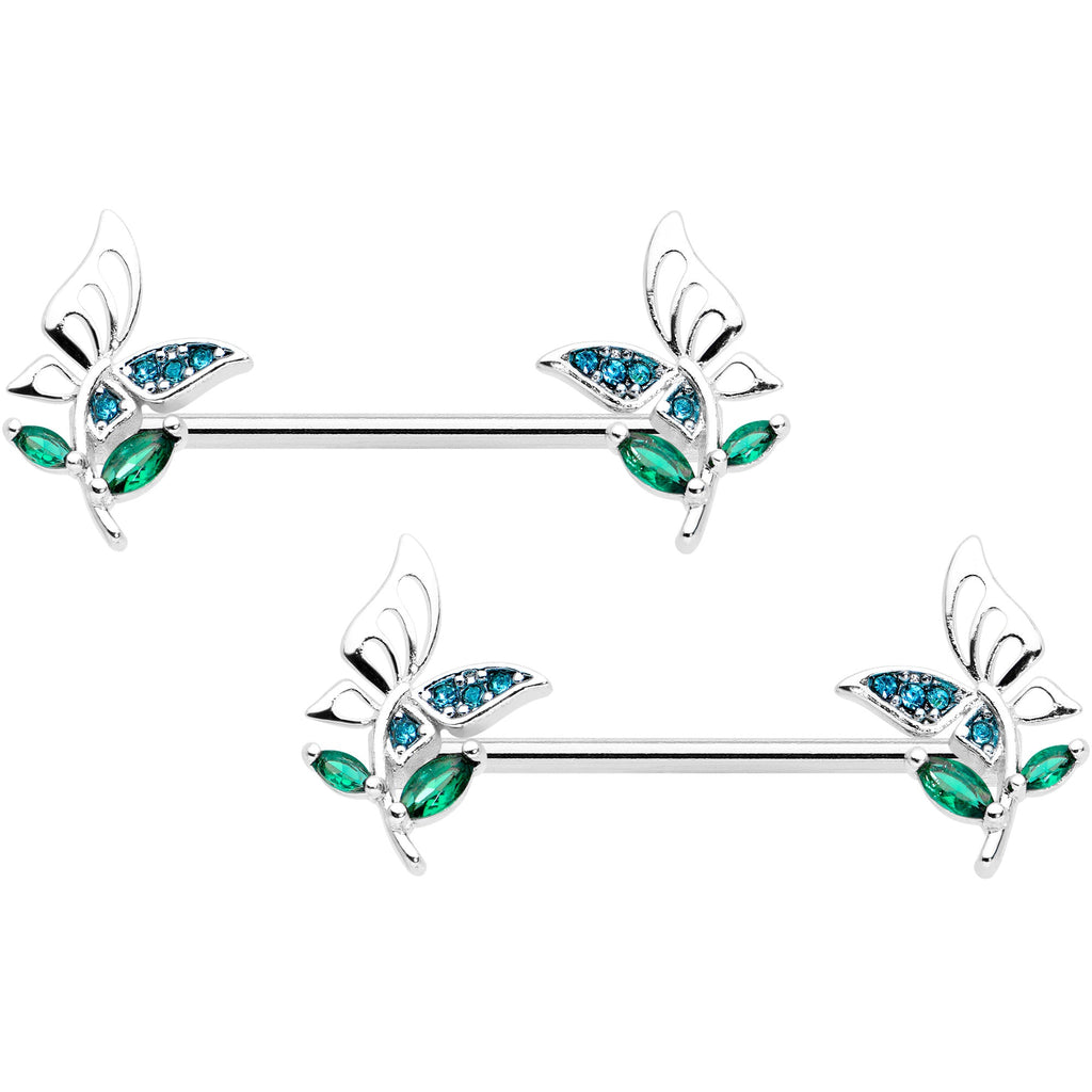 Is it a flower on this 14 gauge nipple jewelry, or is it a butterfly? You can have both! It's made with 14mm durable 316L surgical grade stainless steel straight barbells. Each of the ends features a floral butterfly charm, with green gem leaves. The blossom portions appear to be morphing into butterflies, each with one openwork wing and the other paved in blue gems. Whether it's a flower or a butterfly, these beautiful nipple barbells are sure to blow your mind! Sold as a set of two.Specifications