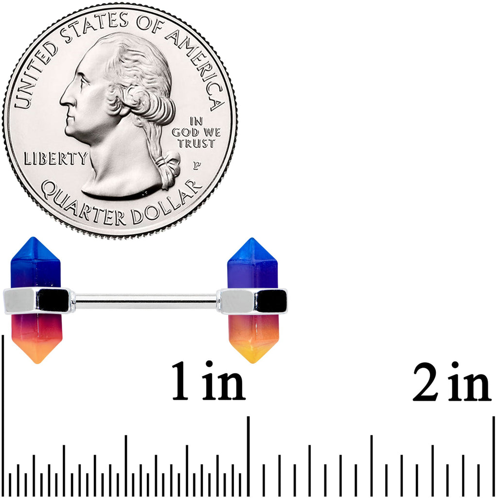 If you're into tie-dye and incense, this 14 gauge nipple jewelry is sure to give you a happier aura! It's made with 14mm durable 316L surgical grade stainless steel straight barbells. Each end features a band holding a vertical tourmaline in dark blue and deepest yellow orange ombre, with its classic obelisk shape. While we can't claim they have any magical powers, they will certainly look magical in your nipple piercings! Sold as a set of two.Specifications