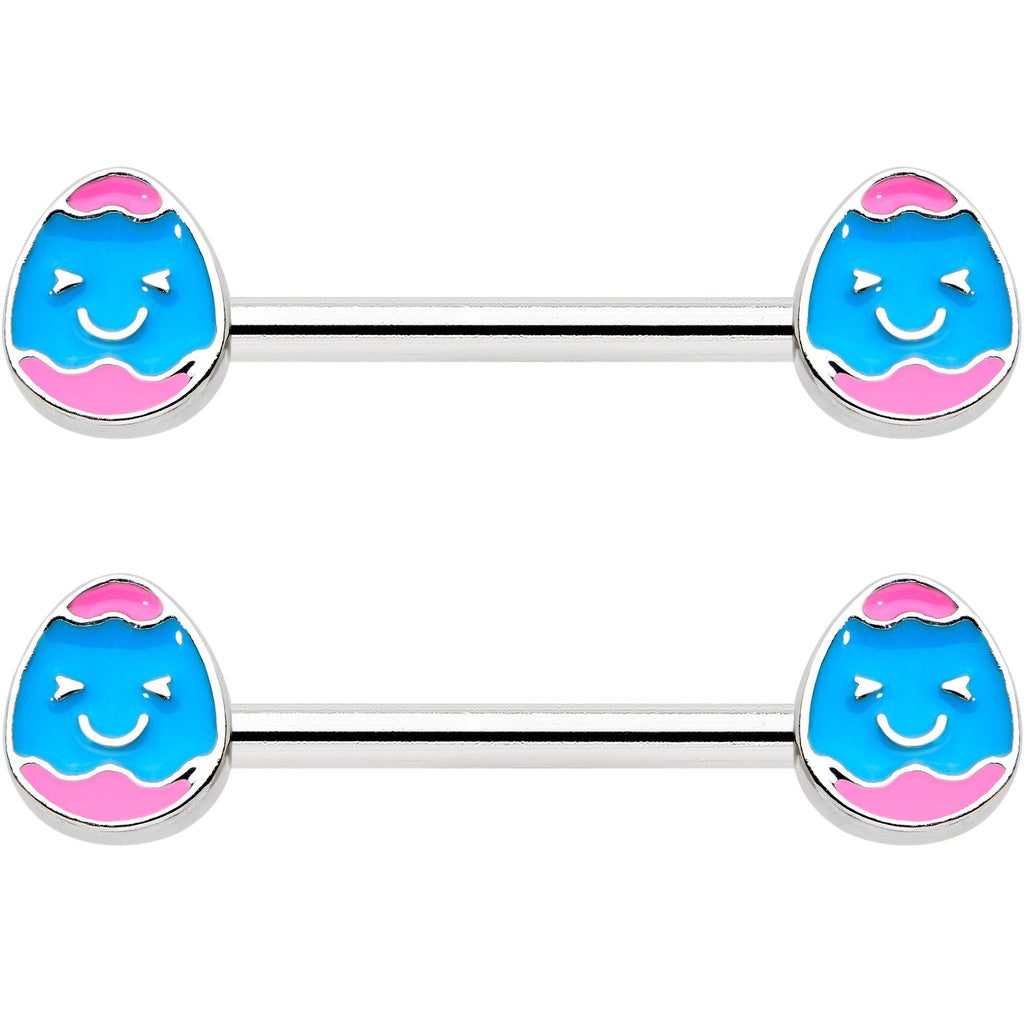 Get ready to hatch a new look for Easter with this 14 gauge nipple jewelry! It's made with 14mm durable 316L surgical grade stainless steel straight barbells. Each of the ends features a blue Easter egg charm, with a cheerful smiling face. The eggs are further embellished with pink ends for a festive touch of color. You won't have to hunt for kawaii style body jewelry for Easter when you're rocking these Easter egg nipple piercing rings! Sold as a set of two.Specifications
