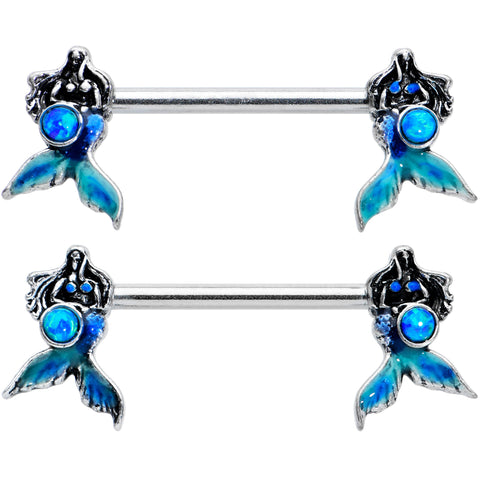 The mermaids on this 14 gauge nipple jewelry have found some beautiful blue treasure! It's made with 14mm durable 316L surgical grade stainless steel straight barbells. Each of the ends features a mermaid charm with abstract, multi-dimensional features. The mermaid's tails are inlaid in blue and they're each set with a round blue synthetic opal - perhaps some undersea treasure? You'll be sure to treasure these nipple rings! Sold as a set of two.Specifications