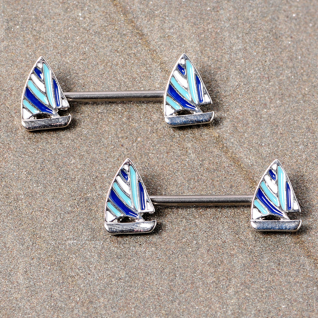 Hoist the anchor and pass the sunscreen, it's time to set sail into style with this 14 gauge nipple jewelry! It's made with 14mm durable 316L surgical grade stainless steel straight barbells. The ends feature sailboat charms, inlaid in shades of navy and light blue and white. These sporty little sailboats are to sure to add a breezy and appealing look to your nipple piercings! Sold as a set of two.Specifications