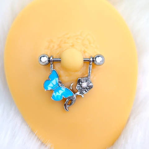 This 14 gauge nipple jewelry is so romantic, it's bound to make your heart flutter like the fluttering wings of a butterfly. It is made with 14mm durable 316L surgical grade stainless steel straight barbells with a 5mm ball end. Dangling from each is a butterfly charm on one side with the wings inlaid in shades of blue and the other other side features a gorgeously understated rose flower. These nipple piercings rings are the pinnacle of romance. Sold as a set of two.Specifications
