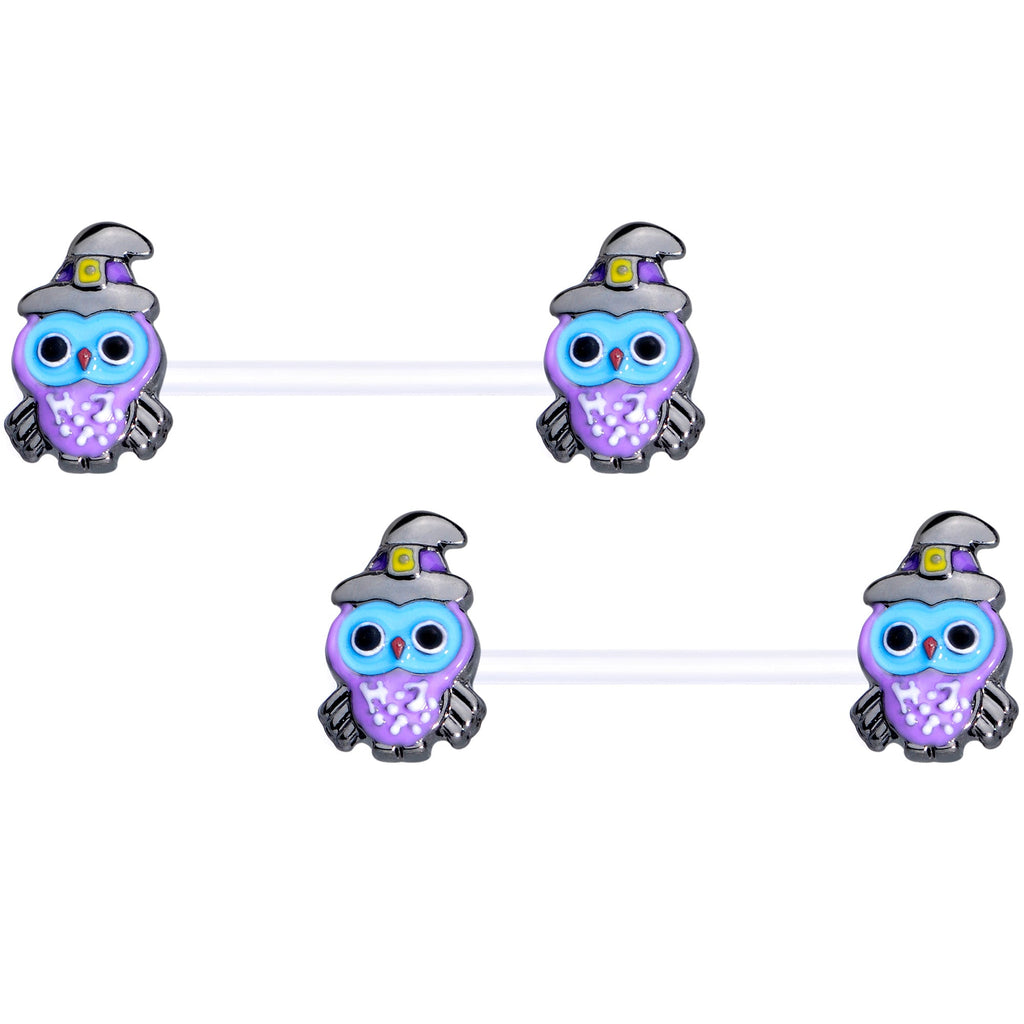 Are they magical owls or witches in disguise? You'll have to decide for yourself with this 14 gauge nipple jewelry! It's made with 14mm clear flexible Bioplast straight barbells. The ends feature purple and blue owl charms wearing gray witch hats with yellow buckles. These also work just as well for wearing during pregnancy as they do for Halloween! You'll want these birds to nest in your nipple piercings all year long. Sold as a set of two.Specifications