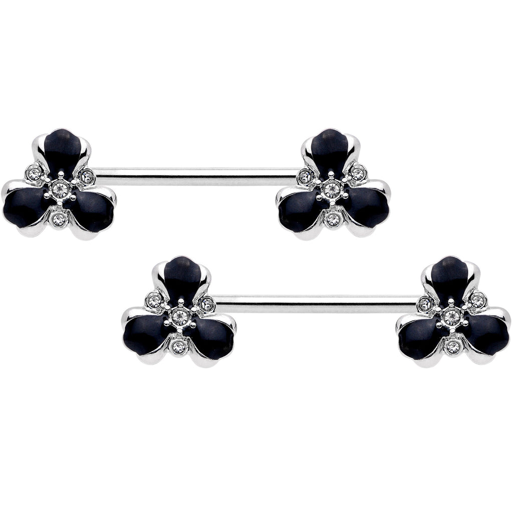 This pretty blossom is brimming over with stylized flair! These 14 gauge nipple rings are made with 14mm durable 316L surgical grade stainless steel straight barbells. The ends feature an abstract pansy flower, made with opaque black gems. The flower is further embellished with clear gems at the center and between the petals. The color contrast and stylized design make for an artfully eye-catching look for your nipple piercing. This pansy is practically perfect! Sold as a set of two.Specifications