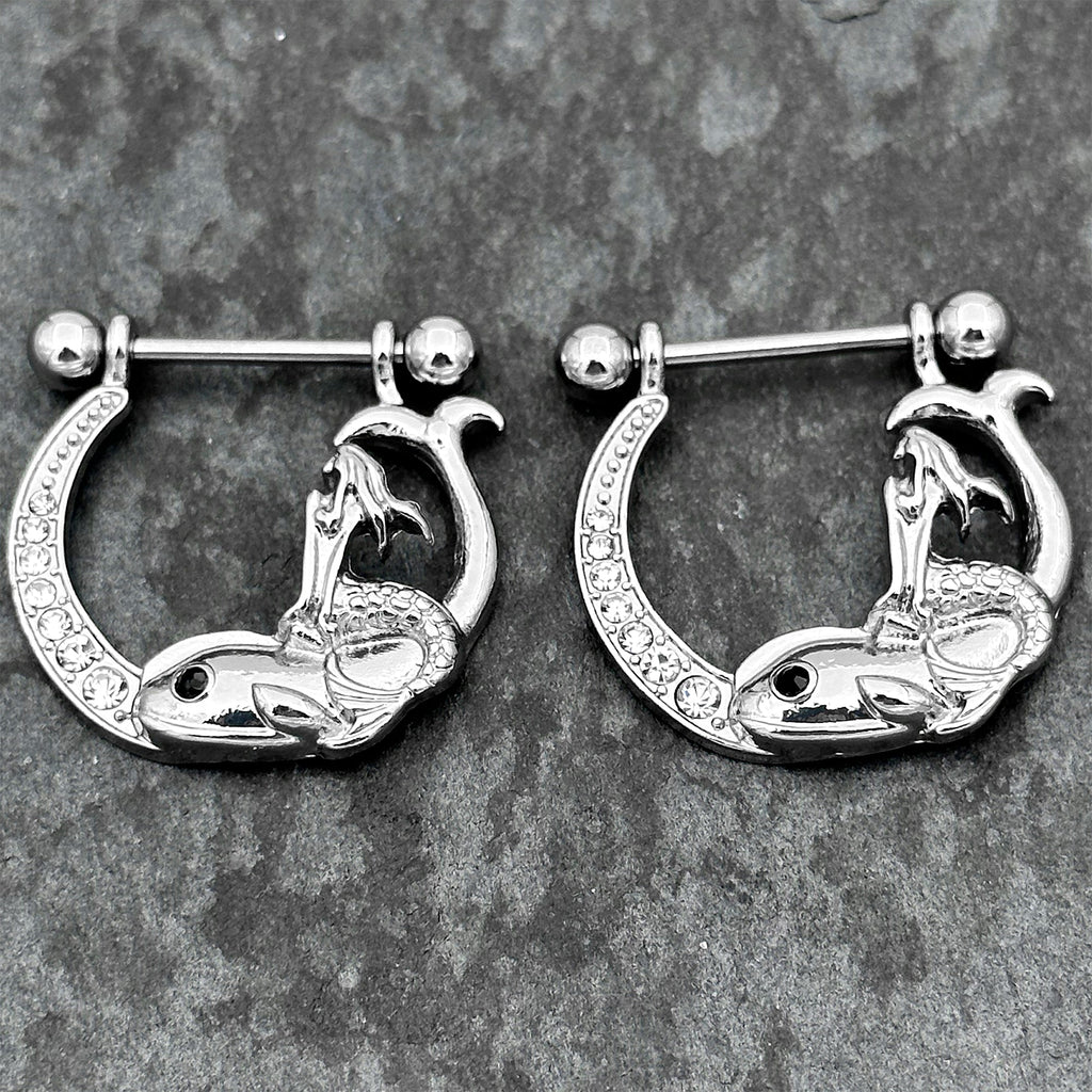 14 Gauge 9/16 Clear Black Gem Riding Mermaid Dangle Nipple Ring Set