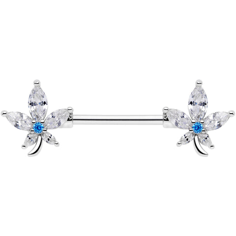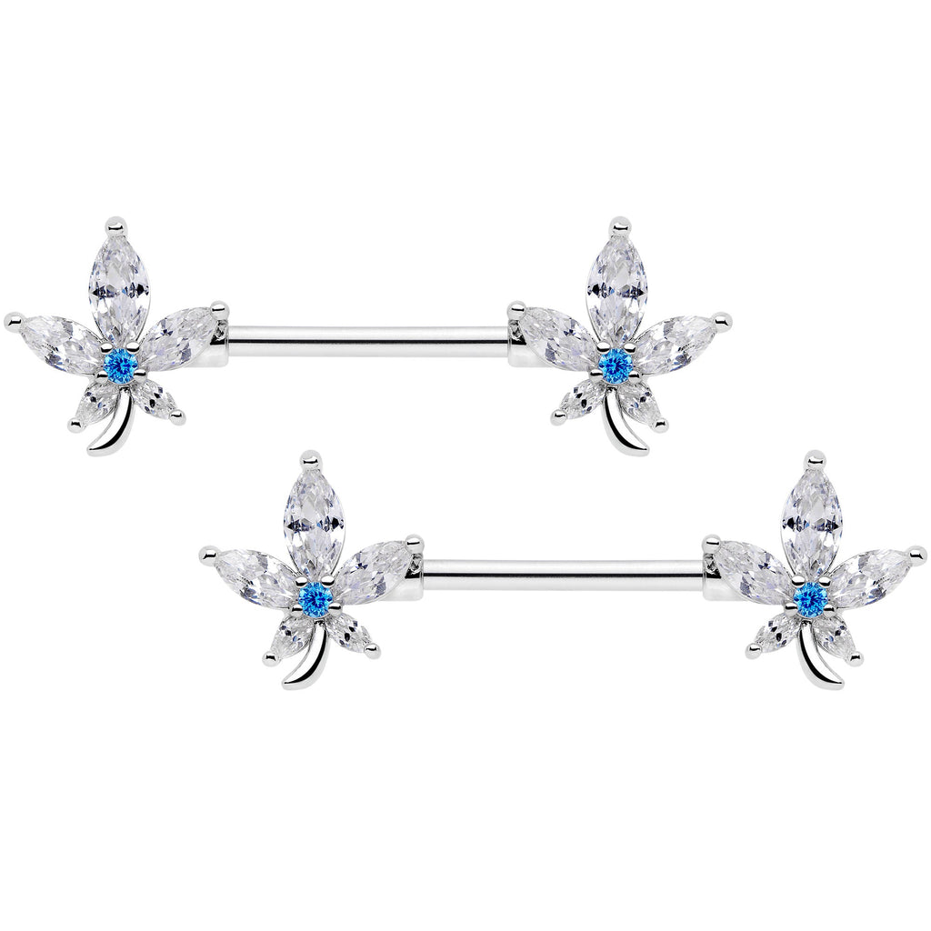 14 Gauge 9/16 Clear Blue CZ Gem Marijuana Leaf Barbell Nipple Ring Set