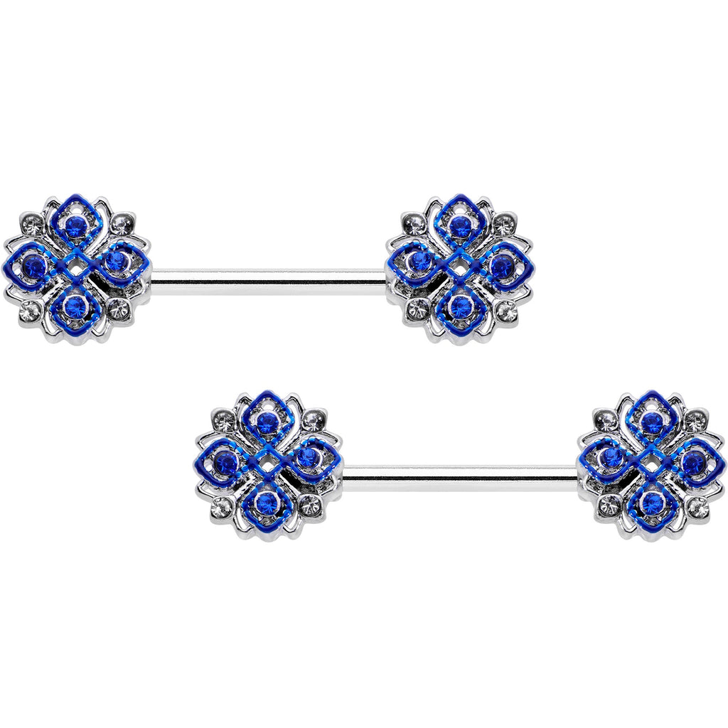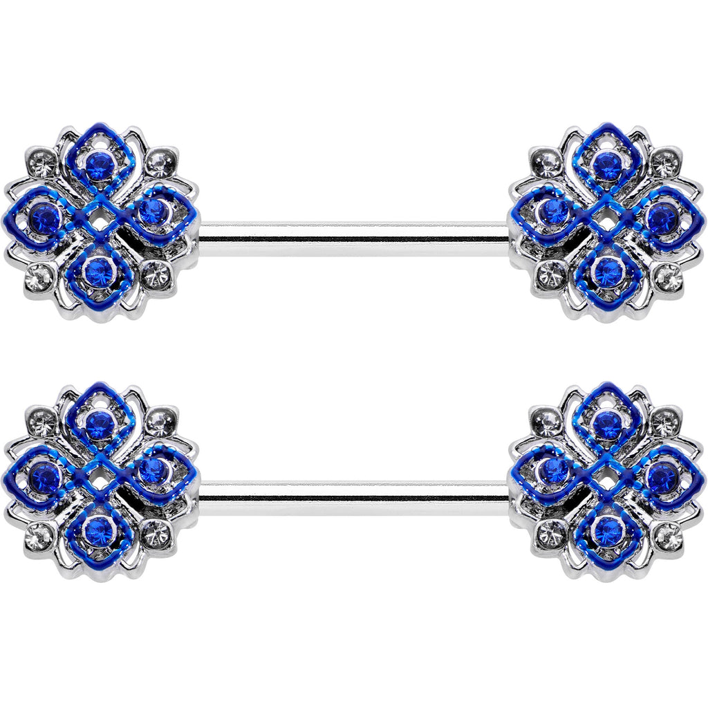 No reason to feel cross when you are rocking this 14 gauge nipple jewelry. It is made with 14mm durable 316L surgical grade stainless steel straight barbells. Each of the ends features a cross charm, set with blue gems at the points. The crosses are nestled among clear gems and feature blue, textured embellishment. Be ready for whatever crosses your path in these colorful nipple piercing rings. Sold as a set of two.Specifications