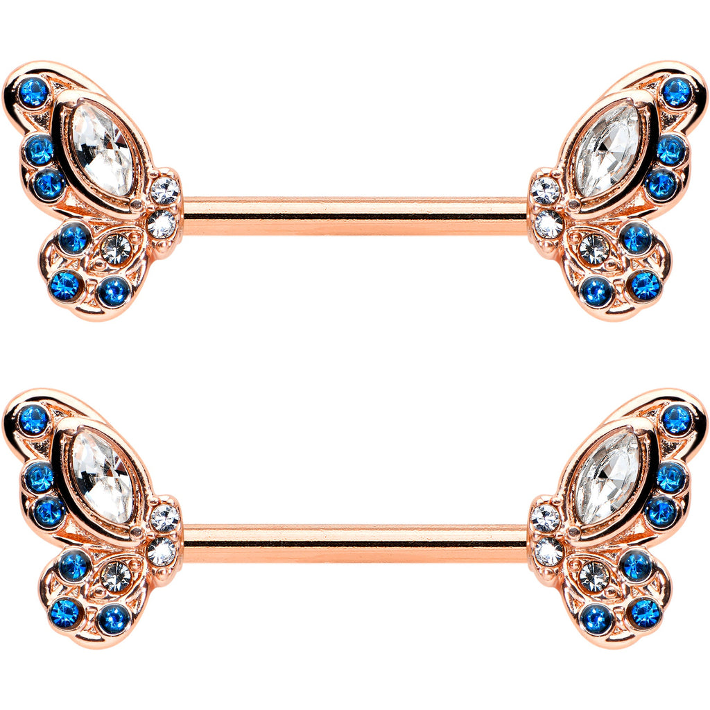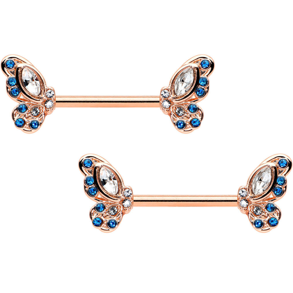 Fall in love with your nipple piercings when you're rocking this 14 gauge nipple jewelry! It's made with 14mm rose gold tone PVD over 316L surgical grade stainless steel straight barbells. Each of the ends features a butterfly wing charm. The butterflies feature scalloped, textured wings, heavily embellished with clear and blue gems for a look that's irresistible. These scalloped nipple piercing rings are sure to have you swooning! Sold as a set of two.Specifications