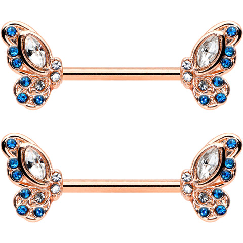 14 Gauge 9/16 Clear Blue Gem Rosy Tone Butterfly Wing Nipple Ring Set