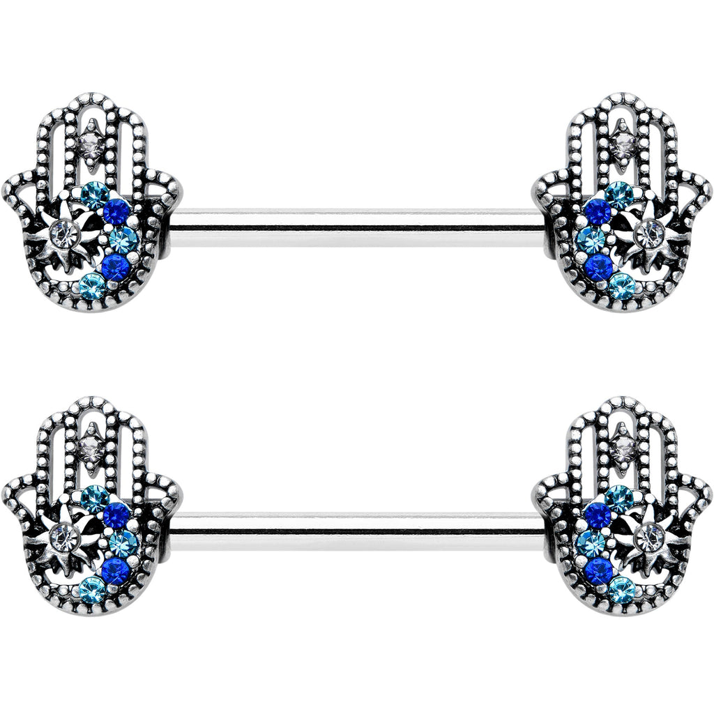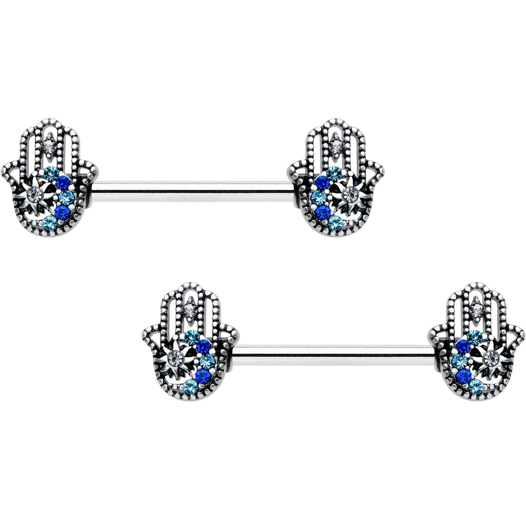 Add a spiritual look and feel to your nipple piercings with this 14 gauge nipple jewelry. It's made with 14mm durable 316L surgical grade stainless steel straight barbells. Each of the ends features a Hamsa hand charm, done in a textured openwork style. The hands are further embellished with a row of blue gems in multiple shades and crowned at the tops and center palms with single clear gems for maximum style. Your spirit will soar and so will your look with these elegant and metaphysical nipple piercing rings. Sold as a set of two.