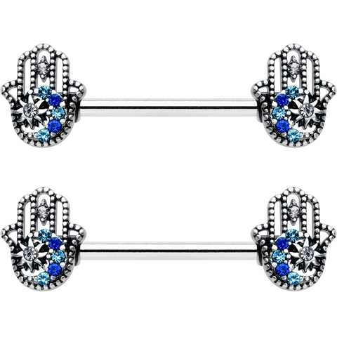 14G 9/16 Clear Blue Gem Textured Hamsa Hand Nipple Ring Set