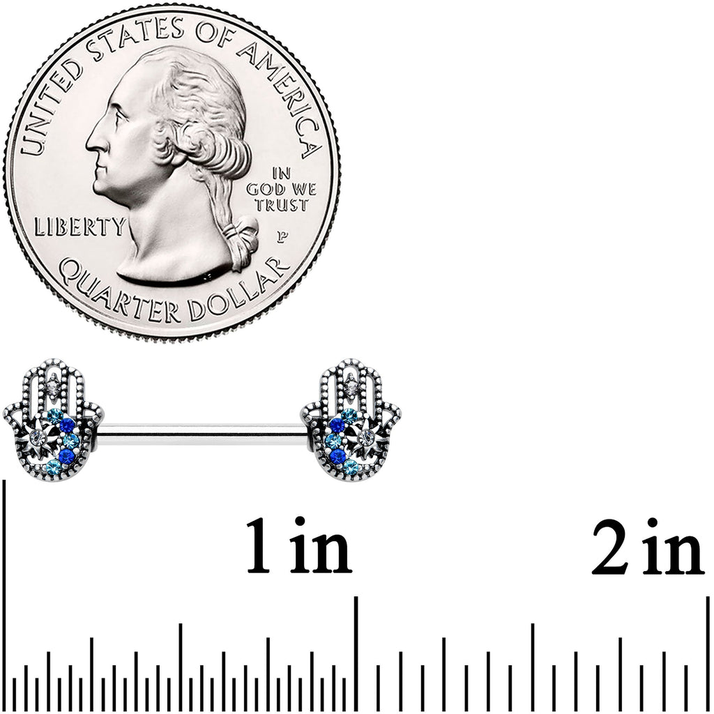 14 Gauge 9/16 Clear Blue Gem Textured Hamsa Hand Nipple Ring Set