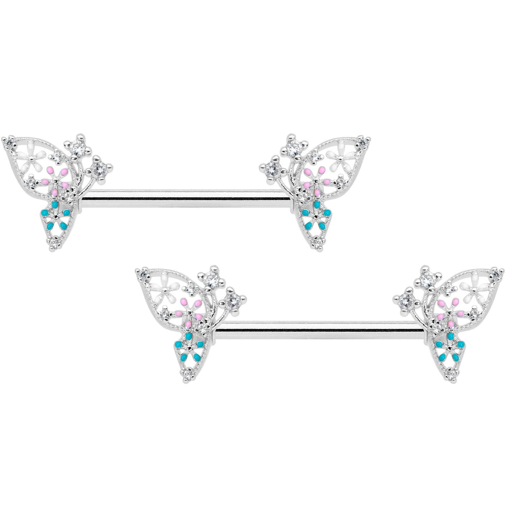 Why stick to the cut and dry when you can get a little abstract with this 14 gauge nipple jewelry? It's made with 14mm durable 316L surgical grade stainless steel straight barbells. Each of the ends features a stylized butterfly charm, with tiny pink and blue flowers hidden within their wings. The butterflies are further embellished with clear cubic zirconia gems for added style. Step into the abstract with style when you're rocking these beautiful butterfly nipple piercing rings! Sold as set of two.Specifications