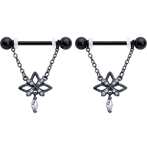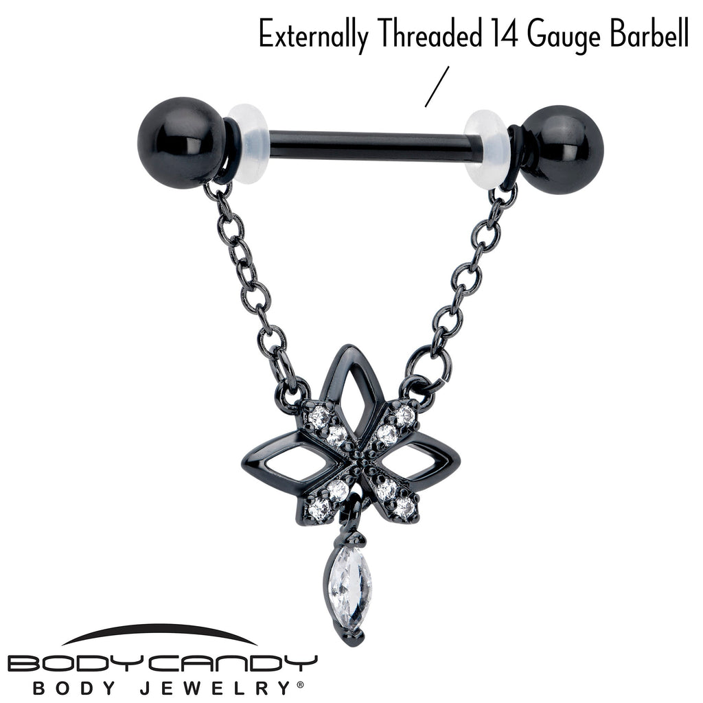 Fall in love with a goth new look, like on this 14 gauge nipple jewelry. It's made with 14mm black PVD over 316L surgical grade stainless steel straight barbells with 5mm ball ends. Each barbell features a double length of matching chain. Dangling from each set of chains is a star charm with an X over it, set with clear cubic zirconia gems along the legs. They are further embellished with matching clear cubic zirconia gem dangles for added style. Let your inner goth come out to play with these darkly divine nipple piercing rings. Sold as a set of two.Specifications