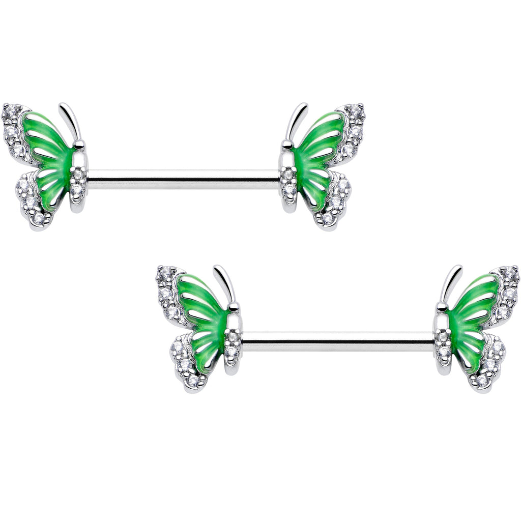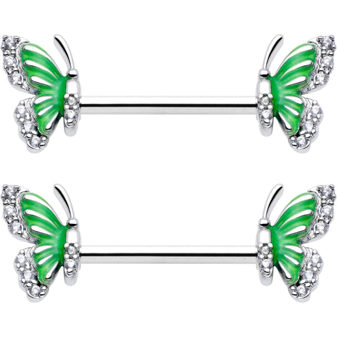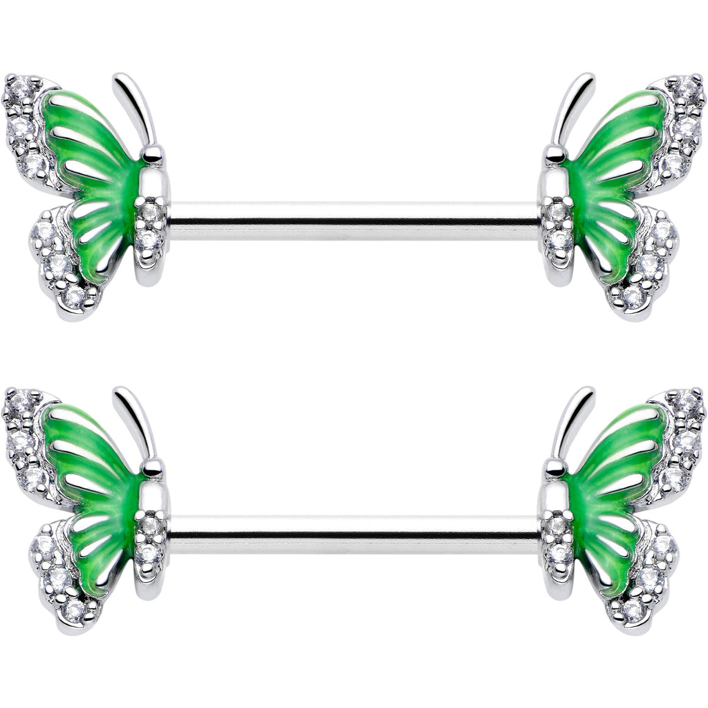 14G 9/16 Clear CZ Gem Butterfly Green Barbell Nipple Ring Set