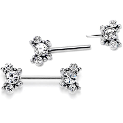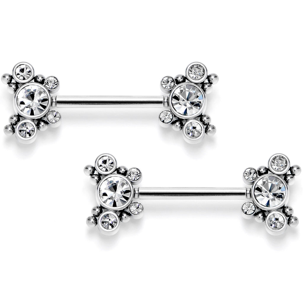 Simple style that goes with everything is what you get with with these 14 gauge nipple rings. They are made with 14mm durable 316L surgical grade stainless steel straight barbells. The ends are set with forward facing clear cubic zirconia gems with a quartet of smaller clear cubic zirconia gems surrounding a larger clear cubic zirconia gem. They feature raised detailing and an threadless design for maximum comfort on insertion and removal while keeping a secure fit. Keep it simple while still keeping it stylish with this eternally elegant nipple piercing jewelry. Sold as a set of two.Specifications