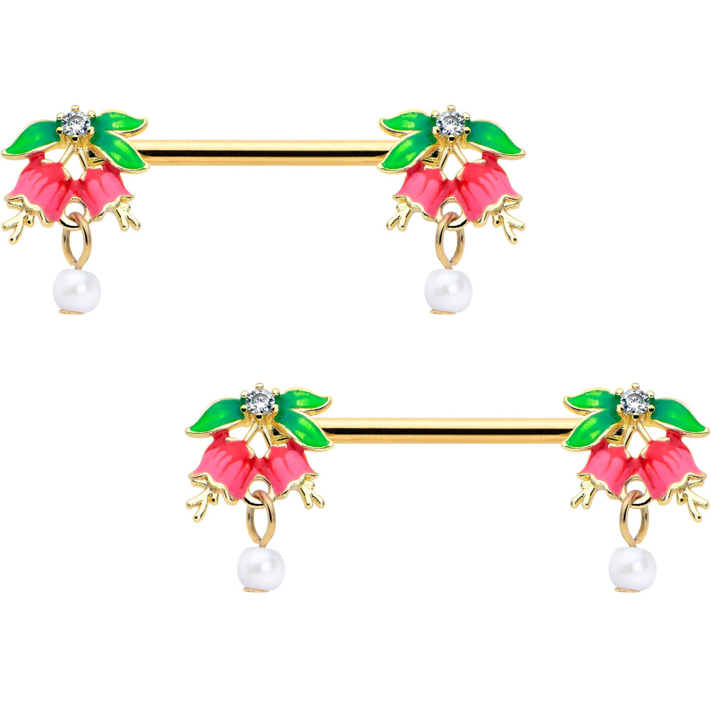 The flowers on this 14 gauge nipple jewelry are sure to ring your bell. It's made with 14mm gold tone PVD over 316L surgical grade stainless steel straight barbells. Each of the ends features a red and pink flowers charm with matching detailing. At the base of the flowers are trios of green leaves with clear cubic zirconia gems at the centers. Dangling from each pair of flowers is a faux pearl for added motion and style. You'll be ready to make some noise when you're rocking these fashionable, floral nipple piercing rings. Sold as a set of two.Specifications
