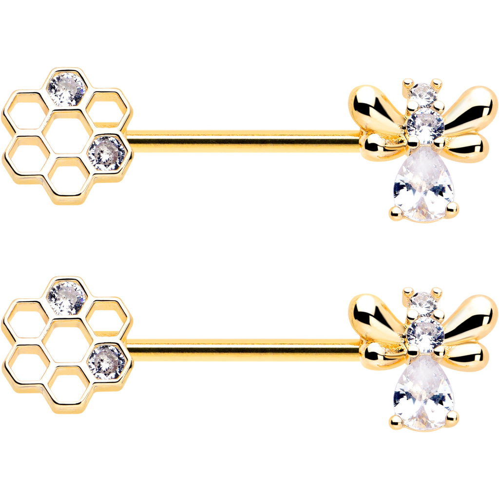 You'll bee the hottest bee in the hive with this 14 gauge nipple jewelry. It's made with 14mm gold tone PVD over 316L surgical grade stainless steel straight barbells. One end features a honeycomb charm, set with clear cubic zirconia gems. The other end features a bee charm with the body composed entirely of clear cubic zirconia gems and contrasting wings. Whether you're a worker, a drone, or the queen, you'll be the sweetest looking honey in the room with these elegant bee and honeycomb nipple piercing rings. Sold as a set of two.Specifications