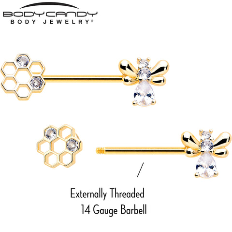 14 Gauge 9/16 Clear CZ Gem Gold Tone Bee Hive Luv Barbell Nipple Ring Set