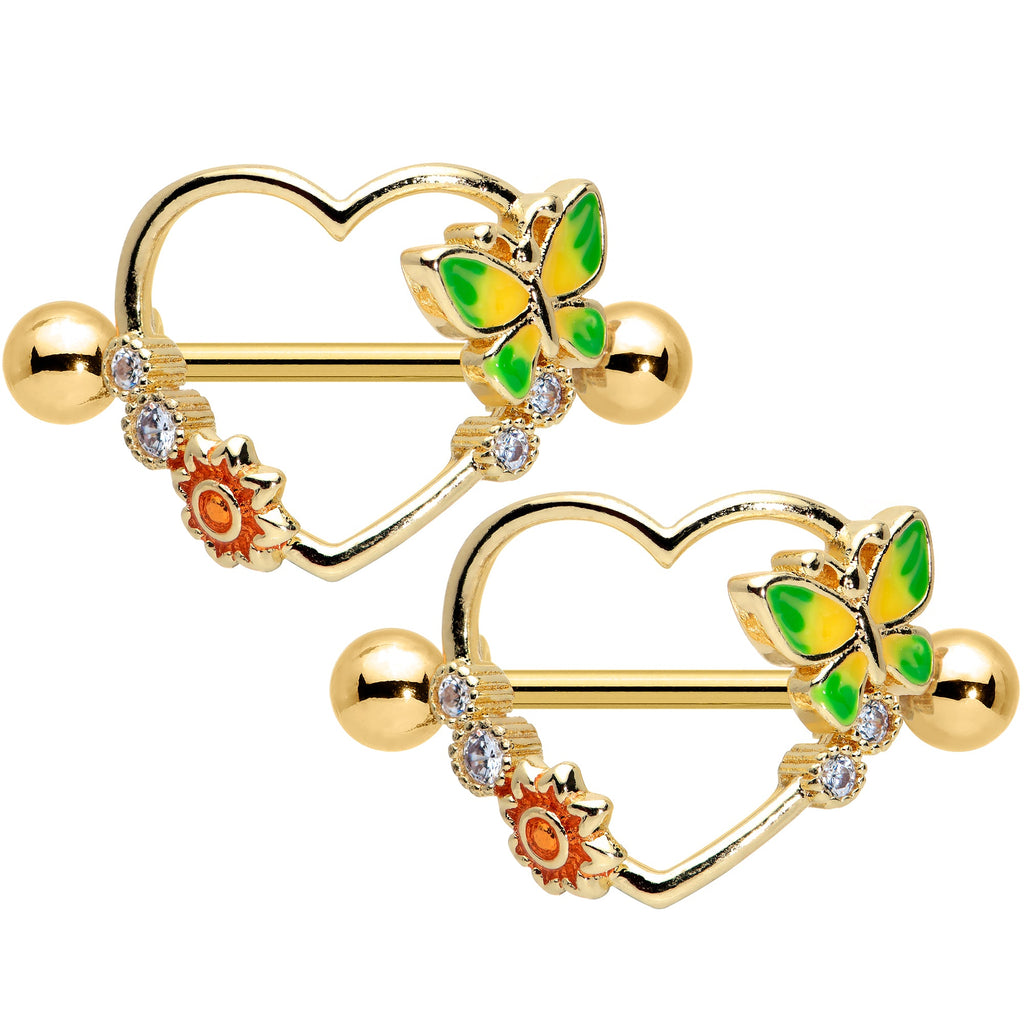 If your heart is open, show the world with this 14 gauge nipple jewelry! It's made with 14mm wearable length gold tone PVD over 316L surgical grade stainless steel straight barbells with 5mm ball ends. The shield portions each feature an open heart design, flanked by a green butterfly and a tiny sun. The hearts are further embellished with small clear cubic zirconia gems for an added touch of glamour. Keep your heart open - you're sure to fall in love with these heart-themed nipple piercing rings! Sold as a set of two.