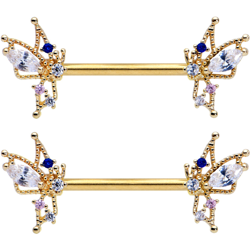 Give your nipple piercings an angel's touch this holiday season with this 14 gauge nipple jewelry! It's made with 14mm gold tone PVD over 316L surgical grade stainless steel straight barbells. Each of the ends features an abstract angel charm formed with clear cubic zirconia gems and a single blue gem above like a Christmas star. Wear your love to the heavens this holiday with these angelic nipple barbells! Sold as a set of two.Specifications