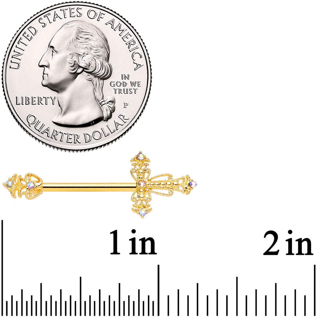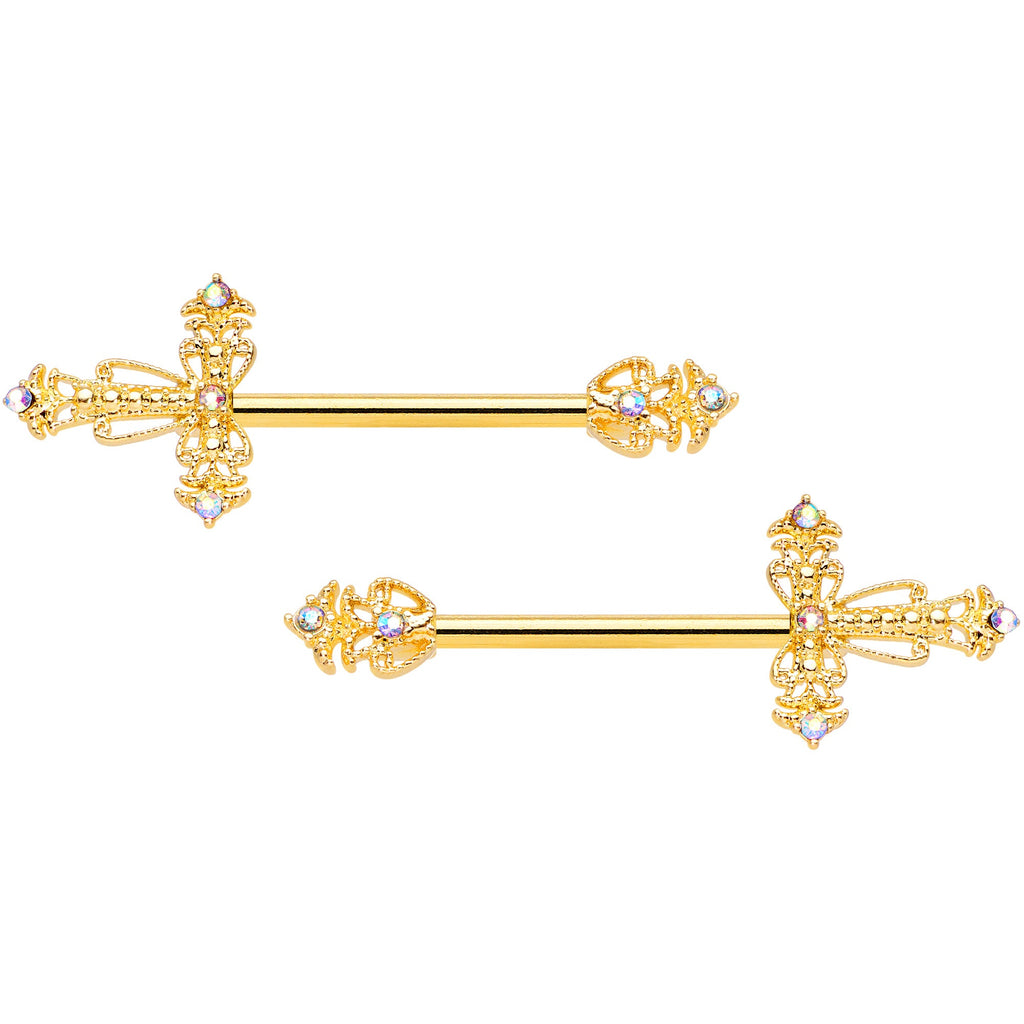 Celebrate your faith without sacrificing style with this 14 gauge nipple jewelry! It's made with 14mm gold tone PVD over 316L surgical grade stainless steel straight barbells. The ends feature the top and bottom ends of a cross charm. They feature scrollwork design for an elegantly airy look and are further embellished with clear cubic zirconia gems. Keep your look while keeping the faith with these elegant cross nipple barbells! Sold as a set of two.Specifications