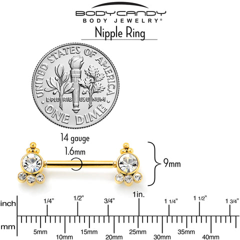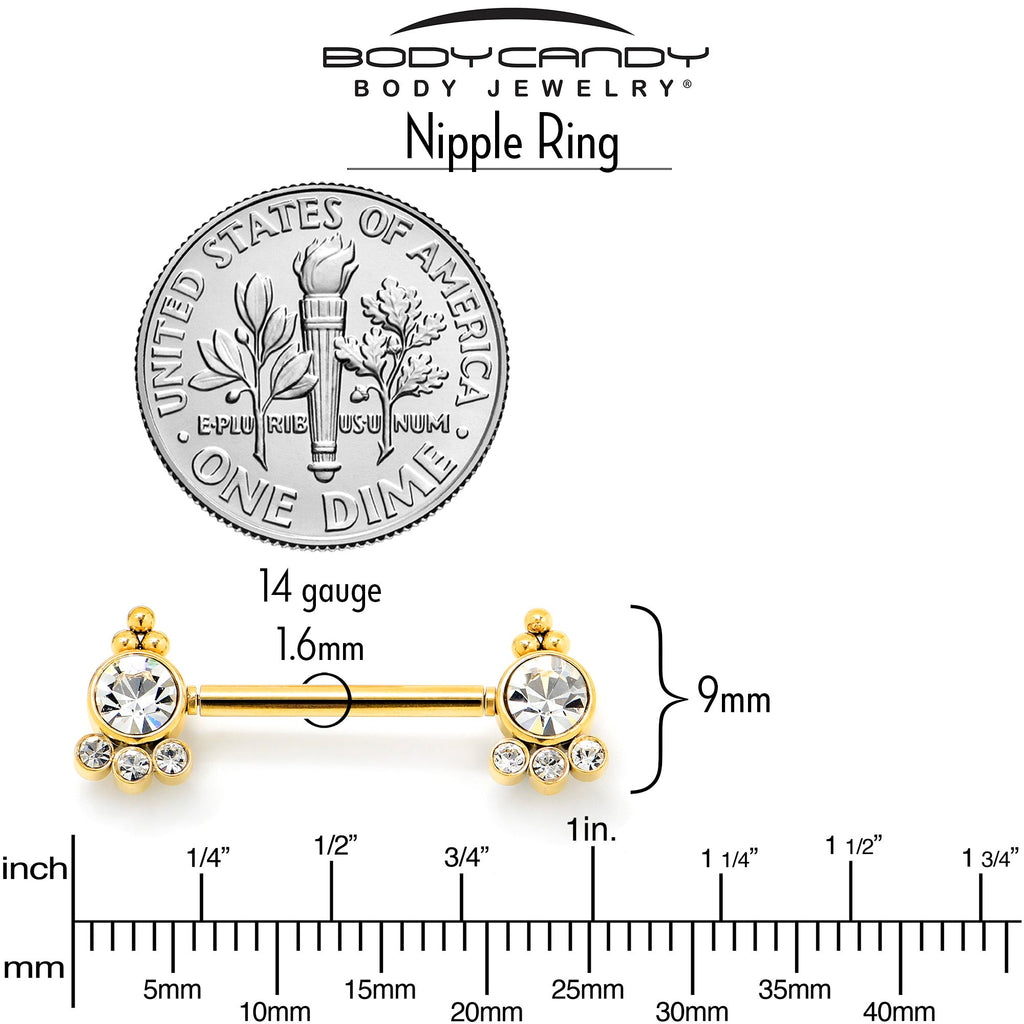 Simple style that goes with everything is what you get with with these 14 gauge nipple jewelry. It is made with 14mm gold tone PVD over 316L surgical grade stainless steel straight barbells. The ends are set with forward facing clear cubic zirconia gems with a trio of smaller clear cubic zirconia gems beneath them and textured detailing above. They feature a threadless design for maximum comfort on insertion and removal and secure fit. Keep it simple while still keeping it stylish with these eternally elegant nipple piercing rings. Sold as a set of two.Specifications