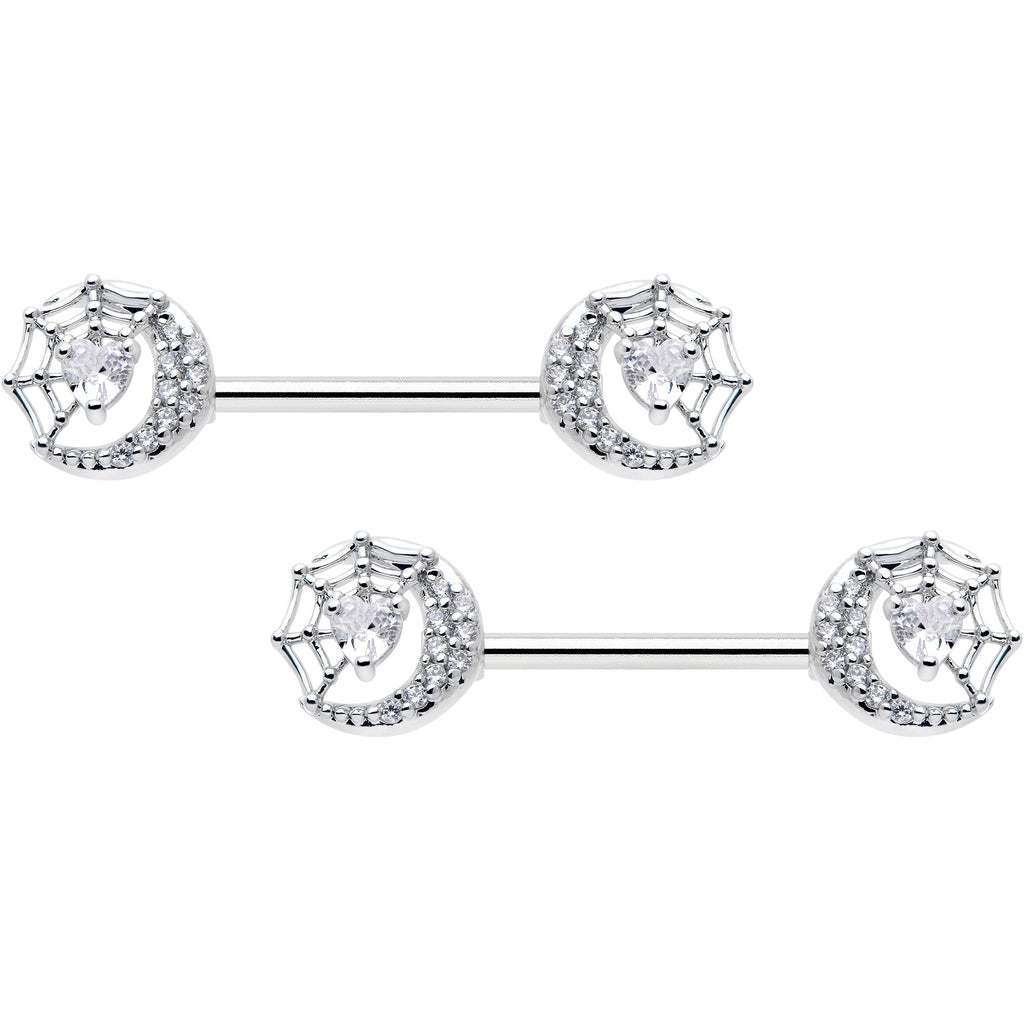 14 Gauge 9/16 Clear CZ Gem Heart Web Moon Barbell Nipple Ring Set