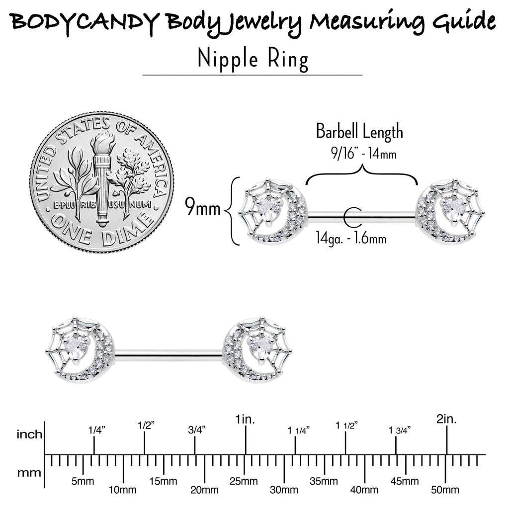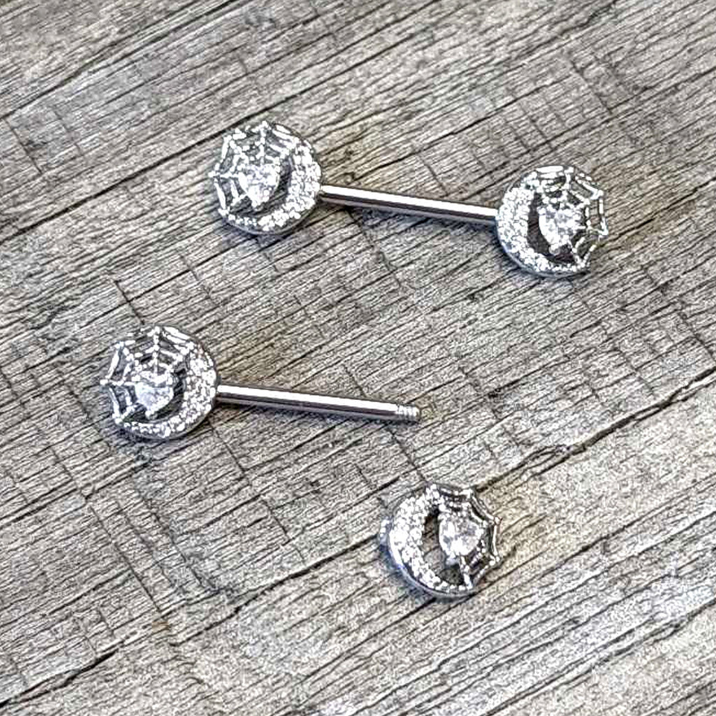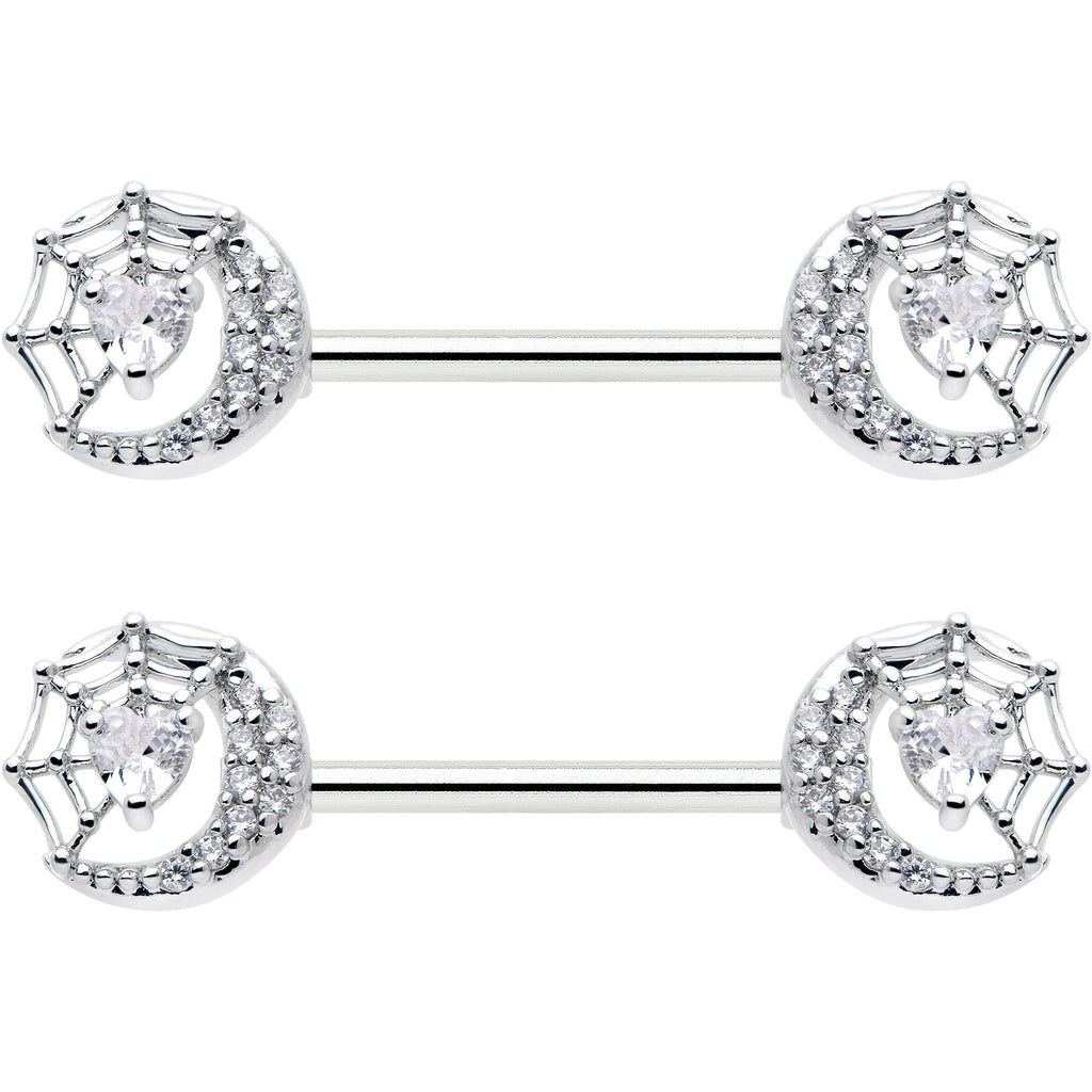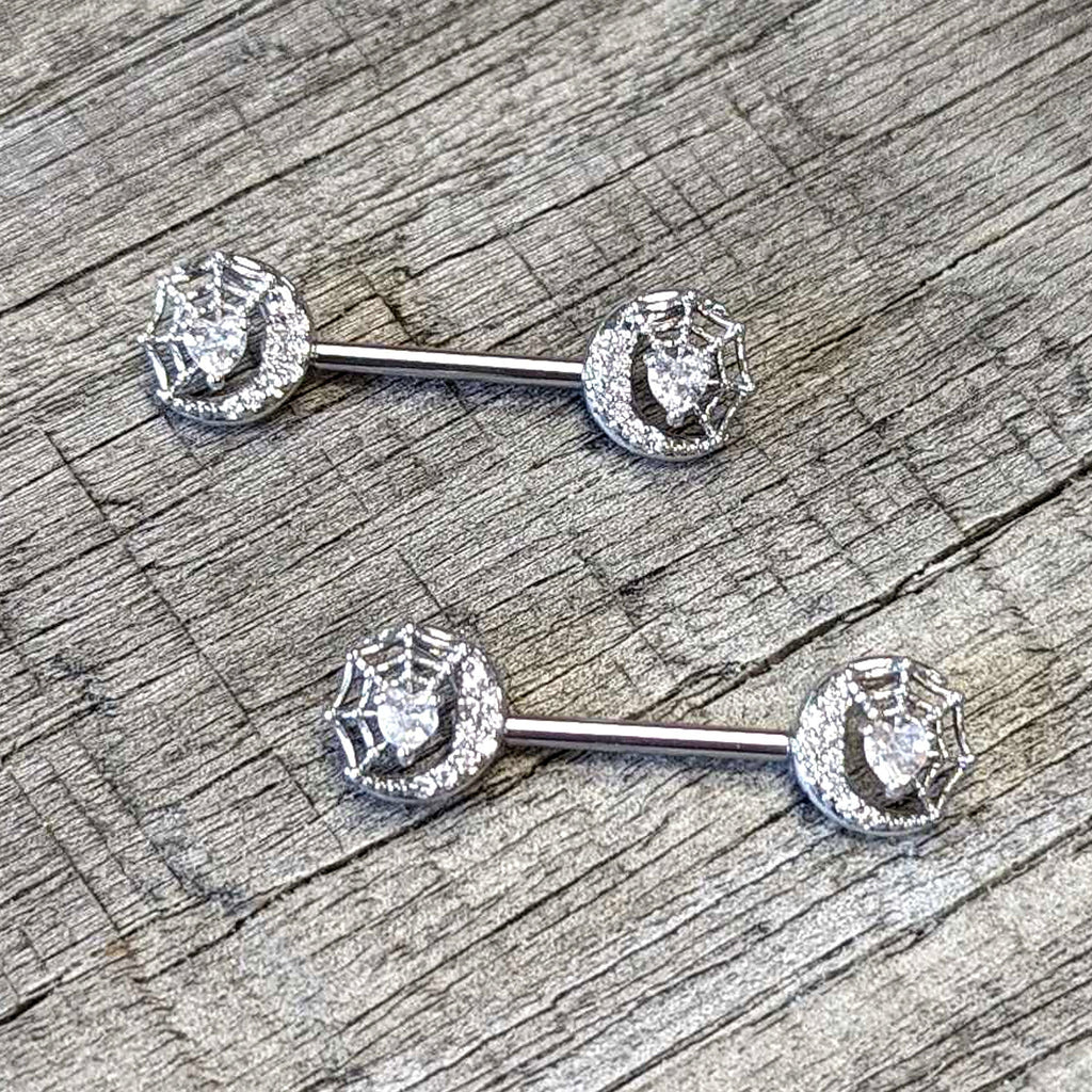 If you are a creature of the night, show it off with this 14 gauge nipple jewelry. It is made with 14mm durable 316L surgical grade stainless steel straight barbells. Each of the ends features a crescent moon charm, set with clear cubic zirconia gems. The ends of the moon are connected with a spiderweb detail, which is set in the center with a heart shaped clear cubic zirconia gem. For gothic glamour, these nipple piercing rings cannot be beat. Sold as a set of two.