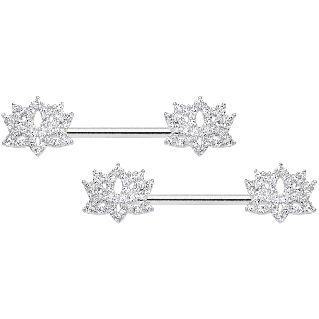 Inner peace is important but so is outer peace - like the kind you get from this 14 gauge nipple jewelry! It's made with 14mm durable 316L surgical grade stainless steel straight barbells. The ends each features a gorgeous lotus flower charm paved with clear cubic zirconia gems. It's a great way to show off your spiritual side, as well as the peace you'll get from knowing how sophisticated and stylish your nipple piercings look! This lotus is sure to soothe your mind - when you look this good, you're sure to feel good too! Sold as a set of two.Specifications