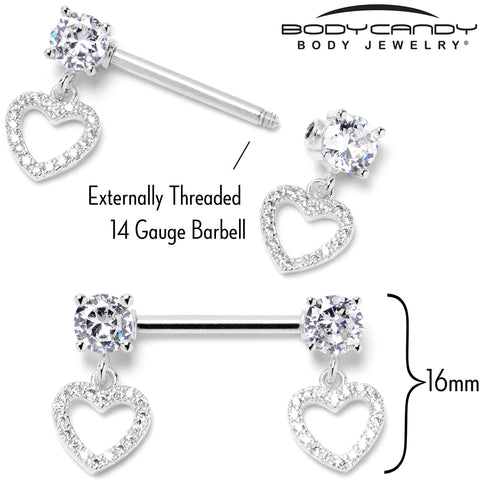 14 Gauge 9/16 Clear CZ Gem Paved Heart Dangle Nipple Ring Set