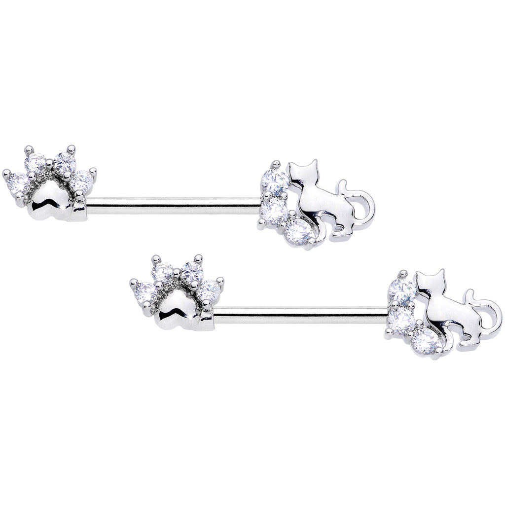 Show off your love for all things cat-related with this 14 gauge nipple jewelry! It's made with 14mm durable 316L surgical grade stainless steel straight barbells. One end features a cat charm perched next to a row of clear cubic zirconia gems. The other end features a cat's paw print charm with the toes composed entirely of clear cubic zirconia gems. Make your point purr-fectly with these fantastically feline nipple rings! Sold as a set of two.Specifications