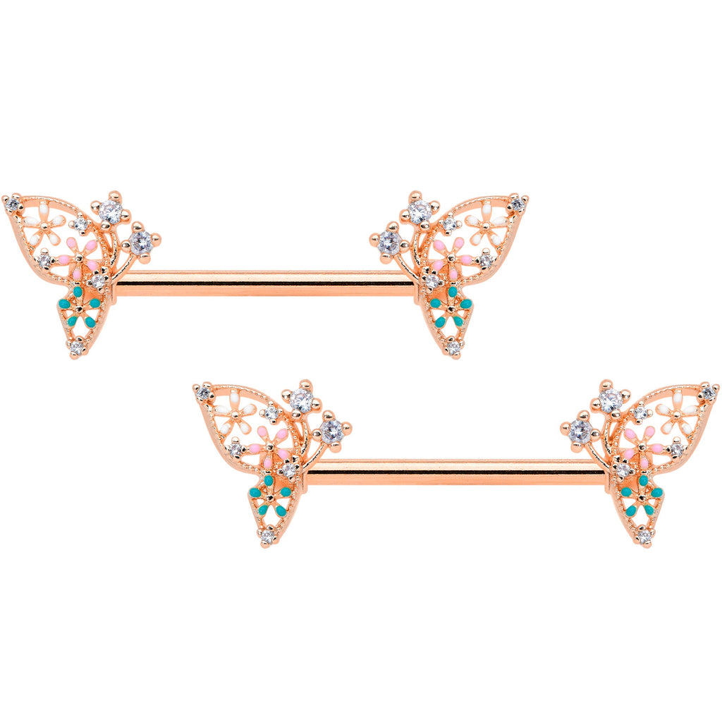 Why stick to the cut and dry when you can get a little abstract with this 14 gauge nipple jewelry? It's made with 14mm rose gold tone plated over 316L surgical grade stainless steel straight barbells. Each of the ends features a stylized butterfly charm, with tiny pink and blue flowers hidden within their wings. The butterflies are further embellished with clear cubic zirconia gems for added style. Step into the abstract with style when you're rocking these beautiful butterfly nipple piercing rings! Sold as set of two.Specifications