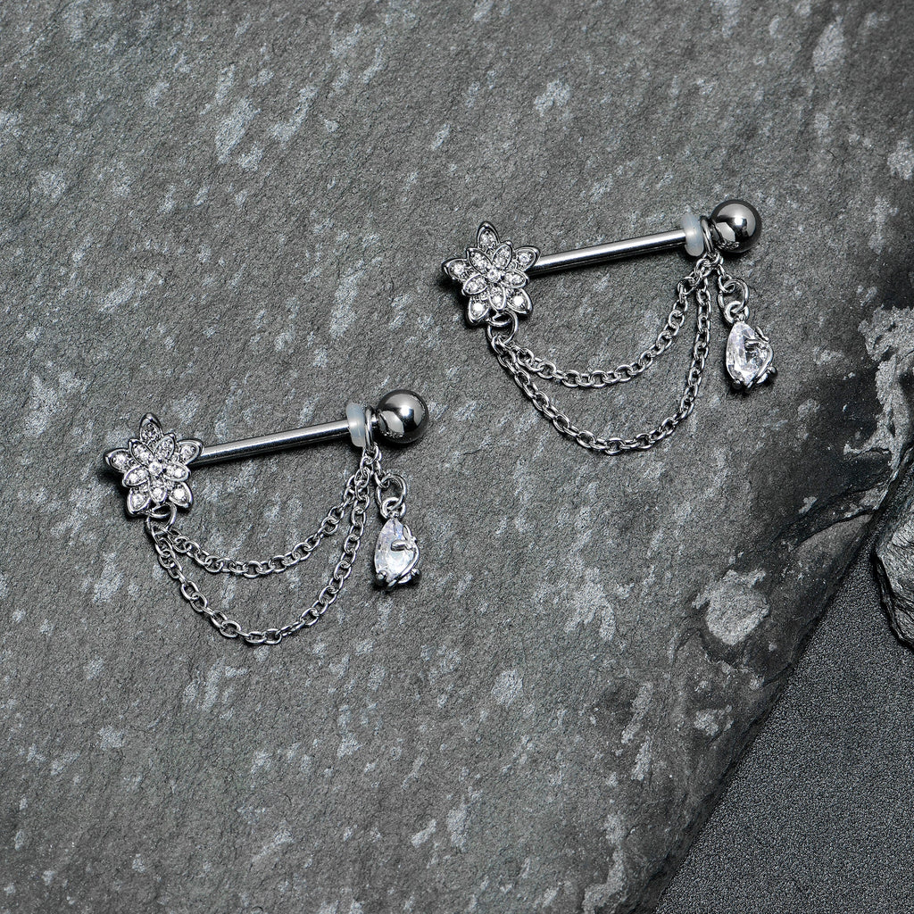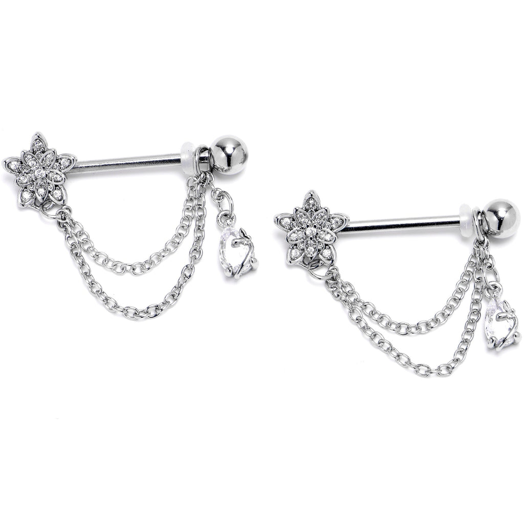 14 Gauge 9/16 Clear CZ Gem Snowflake Flower Chain Dangle Nipple Ring Set