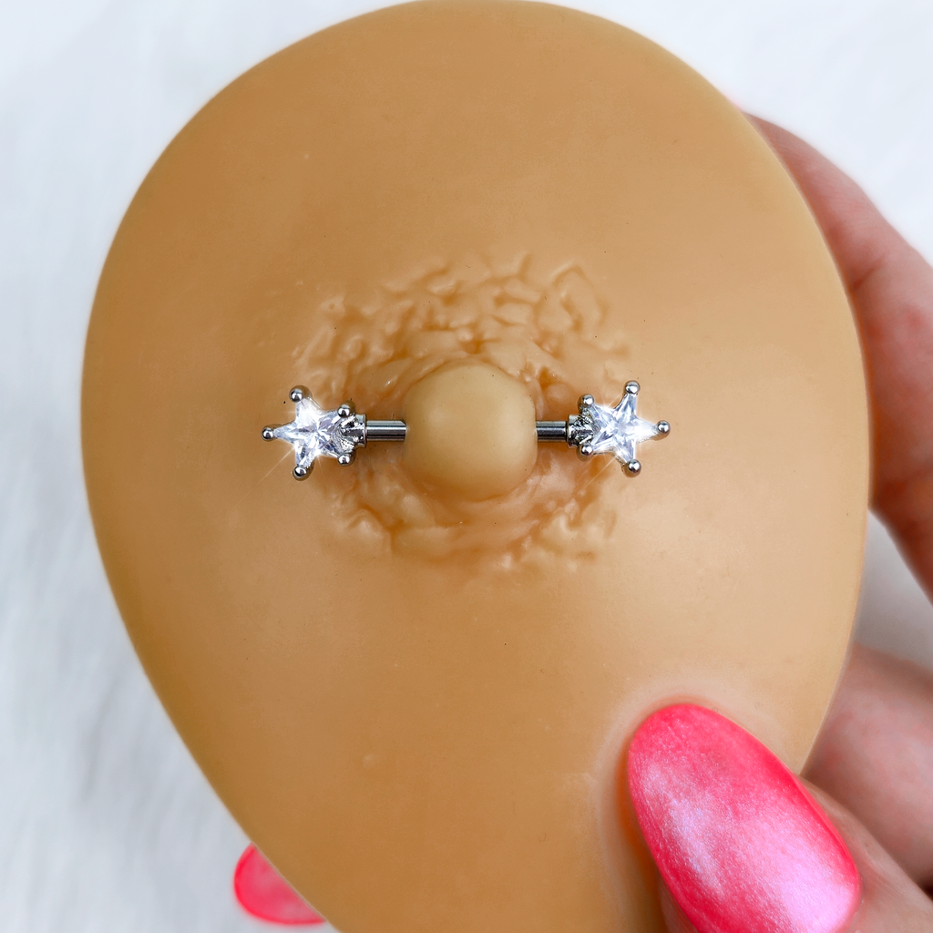 Show off your love of simple style when you wear this pair of pretty 14 gauge nipple rings. Made from 14mm durable 316L surgical grade stainless steel straight barbells, these nipple piercings feature clear cubic zirconia gem star ball ends and are sold as a set of two for you!