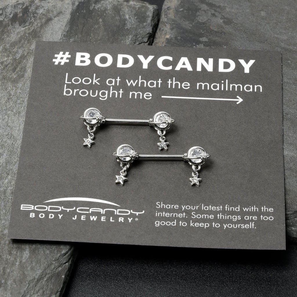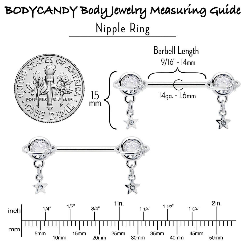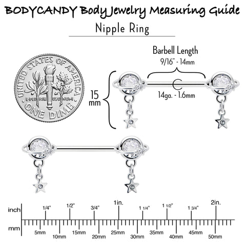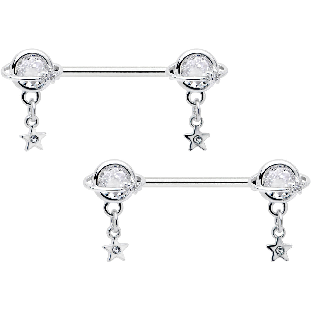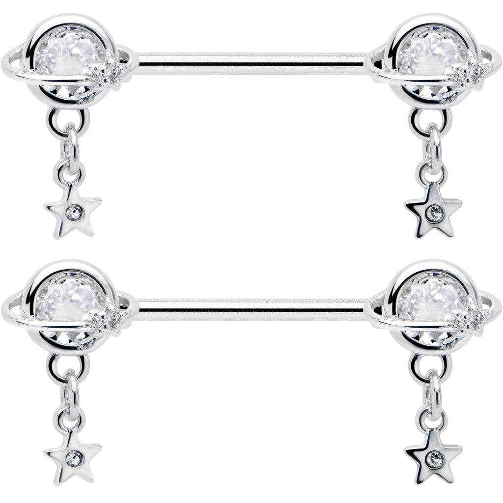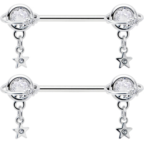 14G 9/16 Clear CZ Gem Starry Saturn Dangle Nipple Ring Set