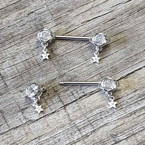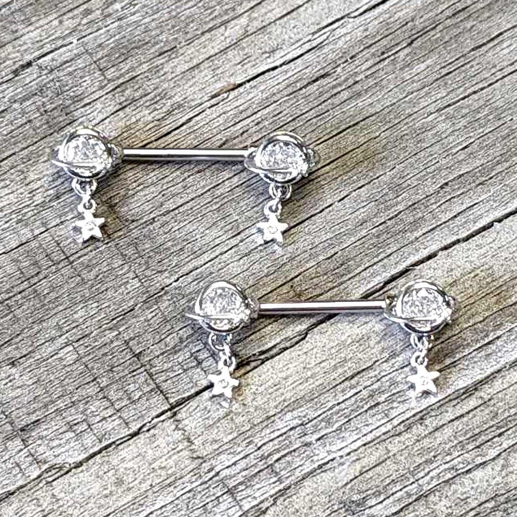This 14 gauge nipple jewelry is out of this world. It is made with 14mm durable 316L surgical grade stainless steel straight barbells. Each of the ends features the planet Saturn, with the planet composed of a single clear cubic zirconia gem and ring. Beneath each planet dangles a small star charm, set with a clear cubic zirconia gem for an added touch of style. These heavenly bodies are sure to make your nipple piercings into stars with these celestial-themed nipple piercing rings. Sold as a set of two.