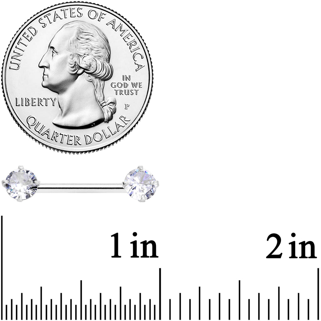 Add some sexy sophistication to your nipple piercings with this 14 gauge nipple jewelry! It's made with 14mm durable 316L surgical grade stainless steel straight barbells. The charm ends are threadless round clear cubic zirconia gems made to make insertion and removal a breeze while still offering a secure fit. With their easy elegance and uncomplicated sophistication, these nipple piercing rings really do have it all! Sold as a set of two.Specifications