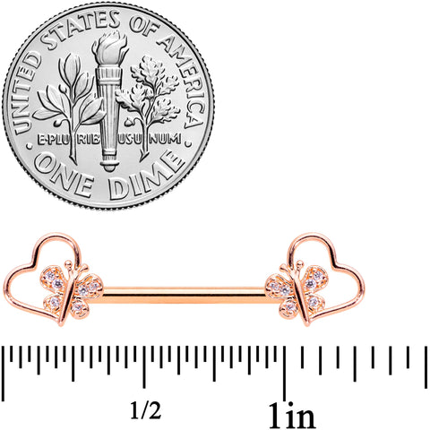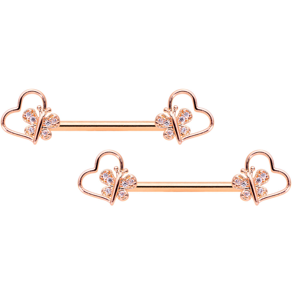 Give your nipple piercings some butterfly wings with this 14 gauge nipple jewelry! It's made with 9/16" rose gold tone PVD over 316L surgical grade stainless steel straight barbells. The ends feature hollow heart charms angled to one side. On the inner side of each heart is a stylized butterfly charm with clear cubic zirconia gems. Let your love for your nipple piercings fly this Valentine's Day like a butterfly with these elegant nipple rings! Sold as a set of two.