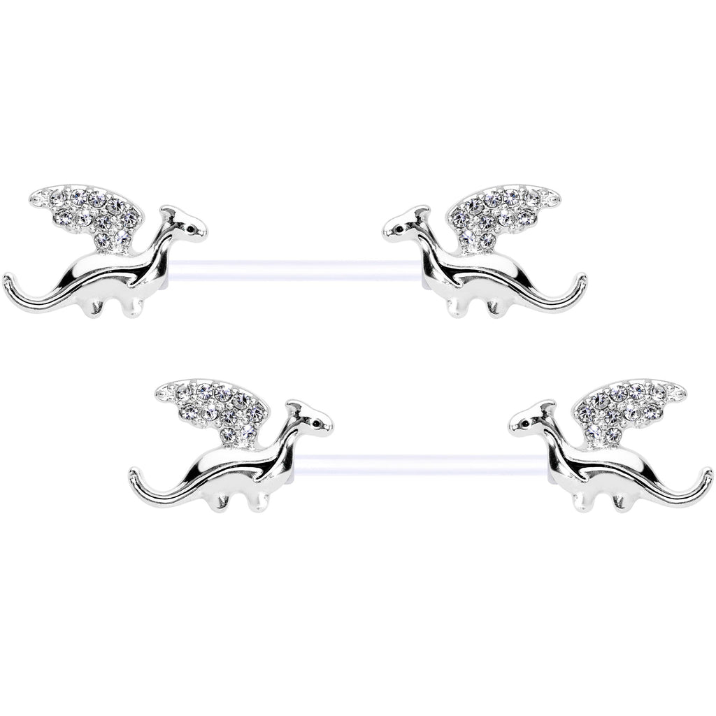 Not all dragons are fire-breathing monsters. Some are simply adorable, like the one on these 14 gauge nipple rings! They're made with 14mm clear flexible Bioplast straight barbells. The ends each feature a dragon charm with clear gems set into their wings. Let these dragons breathe their sweet style into your nipple piercings! Sold as a set of two.Specifications