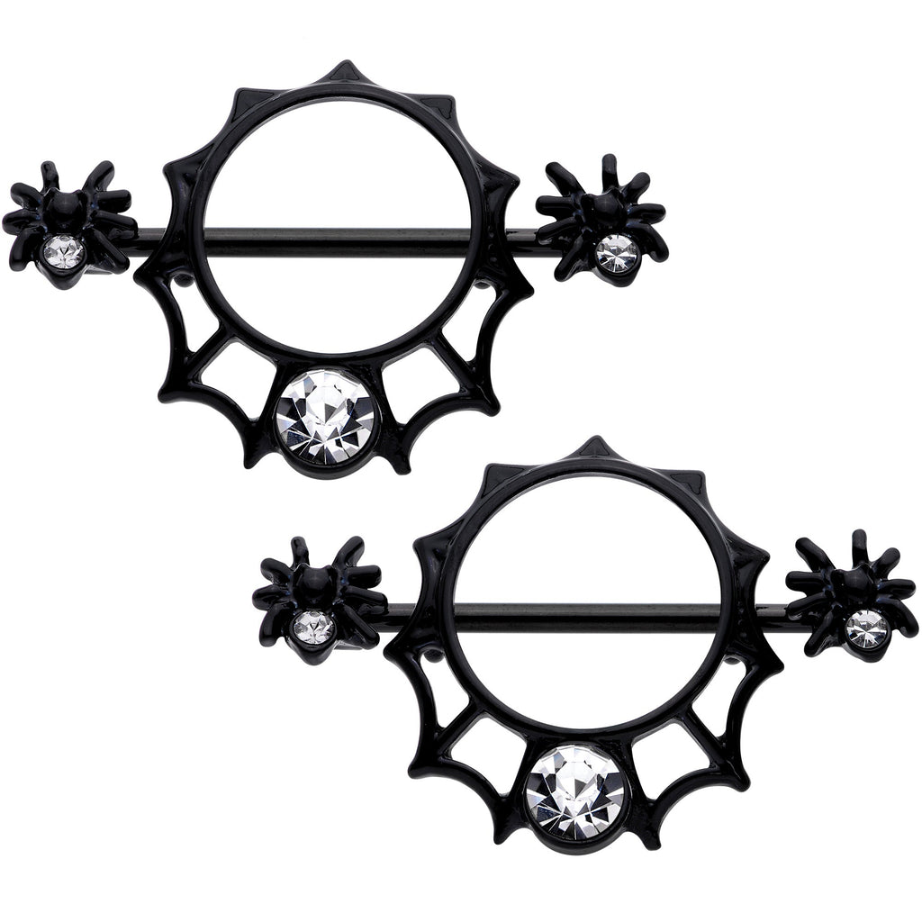 These Halloween creepy critters have decided to weave their webs around your nipple piercings! The 14 gauge nipple jewelry is made with 14mm black PVD over 316L surgical grade stainless steel straight barbells. The barbell nipple rings feature spider charms with legs and clear gems set into their bodies. Their webs make up the shield charm with a large clear gem set at the bottom center. Whether you adore arachnids or celebrate Halloween every day of the year, these spiders are sure to crawl into your heart! Sold as a set of two.Specifications
