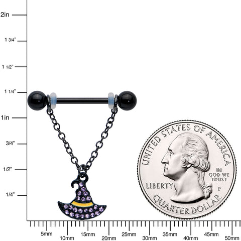 14 Gauge 9/16 Clear Gem Black Witch Hat Chain Dangle Nipple Ring Set