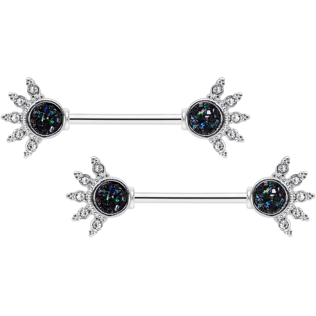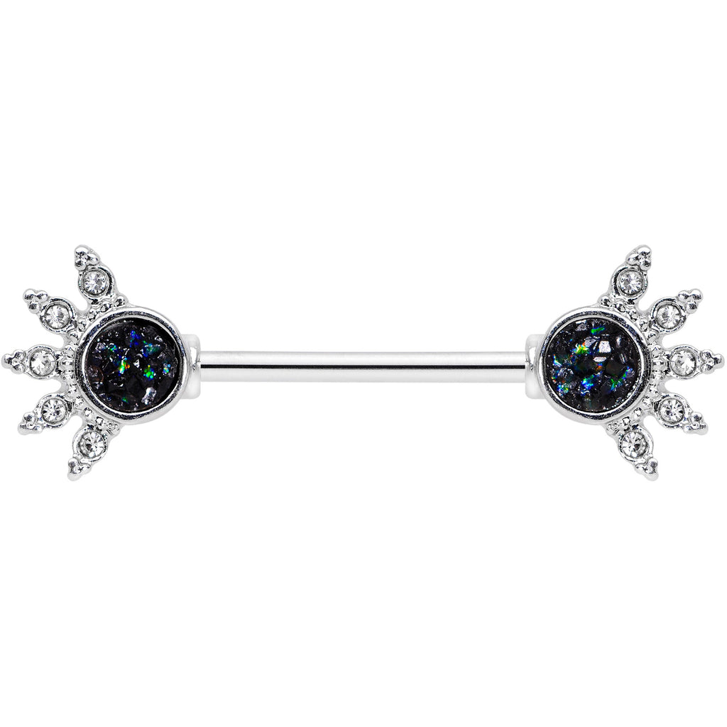 Punctuate your piercings between some classy crests with these 14 gauge nipple rings! They're made with 14mm durable 316L surgical grade stainless steel straight barbells. The ends feature rounds of blue faux druzy, set along the outer edges with a fan of tiny points that are paved with clear gems. Add some emphasis where it really counts with these crested nipple barbells! Sold as a set of two.Specifications