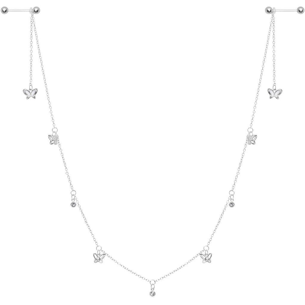 Get ready to celebrate all the animals of spring and summer with this pretty 14 gauge dangle nipple jewelry! Made with 14mm durable 316L surgical grade stainless steel straight barbells, these nipple piercings feature a 14" maximum length chain whose position can be adjusted with o-rings and butterfly dangle charms with white details or clear gems. Your partner will be hypnotized, but not by your eyes!Specifications