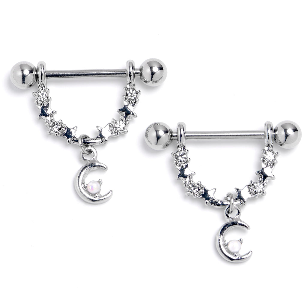 Feel like you are among the stars with this 14 gauge nipple jewelry. It is made with 14mm durable 316L surgical grade stainless steel straight barbells with 5mm ball ends. Each one supports a length of clear gems and tiny stars. Dangling beneath each one is a crescent moon charm, embellished with another clear gem. You will be starry eyed in love with these heavenly nipple piercing rings. Sold as a set of two.Specifications