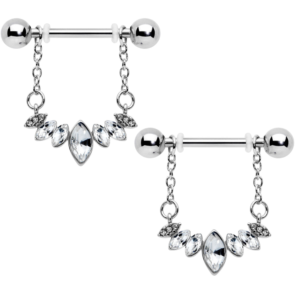 14 Gauge 9/16 Clear Gem Crowning Glory Chain Dangle Nipple Ring Set