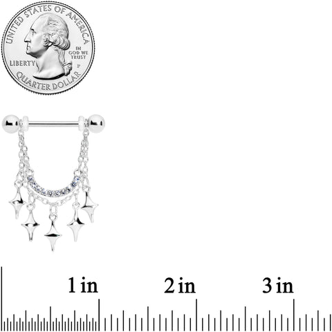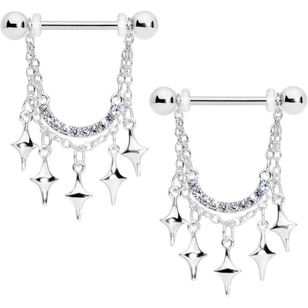 You get twice the drama when you wear this 14 gauge nipple jewelry in your nipple piercings! It's made with 14mm durable 316L surgical grade stainless steel straight barbells with 5mm ball ends. Dangling from the barbell are a pair of chains, one of which supports an arc of clear gems. The other chain supports five hanging charms, their stylized rhombus shape helping to draw the eye vertically. If you want glamour and eye-catching dramatic style for your nipple piercings, these nipple rings are sure to add some allure! Sold as a set of two.Specifications