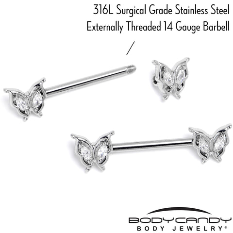 Add some butterfly fabulousness to your look with this 14 gauge nipple jewelry. It is made with 14mm durable 316L surgical grade stainless steel straight barbells. Each of the ends features a butterfly charm, embellished with simple detailing. Their wings are set with clear gems for an added touch of style. Fill your look with fabulous fashion with these lovely butterfly nipple piercing rings. Sold as a set of two.Specifications